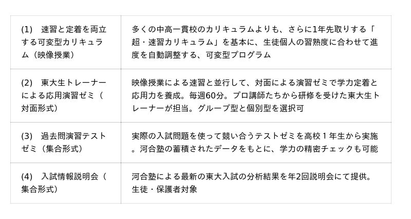 また、河合塾マナビスが2006年のスタート以来培ってきた映像授業のノウハウと、多くの中高一貫校のカリキュラムをさらに1年先取りする「超・速習カリキュラム」を基本に、生徒の習熟度に応じて進度を自動調整する可変型プログラムを組み合わせ、東大をめざす中高一貫校生やトップ公立高校生に最適な学習環境を提供します。