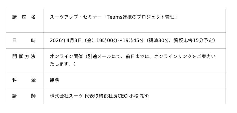 当社では、2026年4月3日(金)19時から、当社代表の小松が講師を務めるスーツアップ・セミナー「Teams連携のプロジェクト管理」を無料開催します。