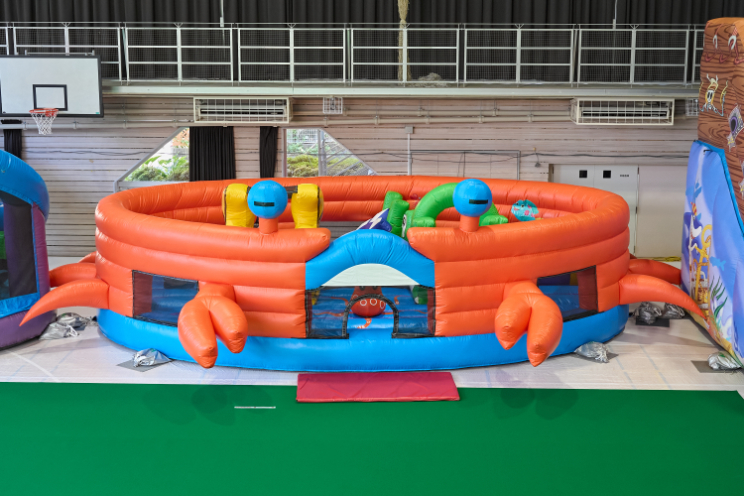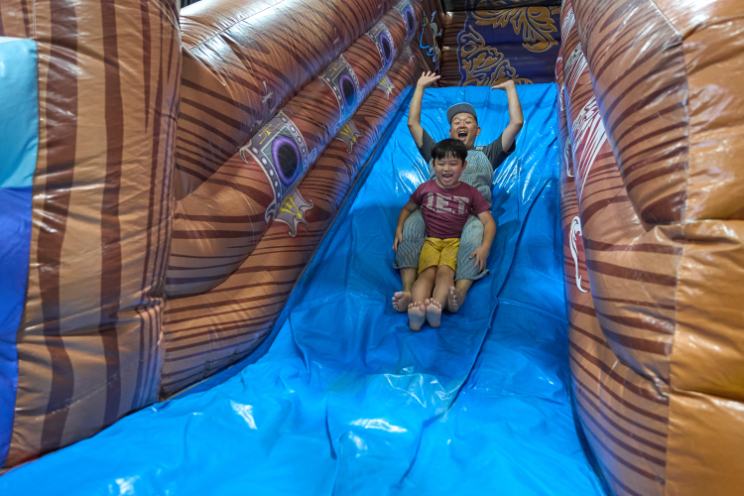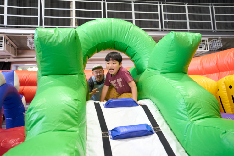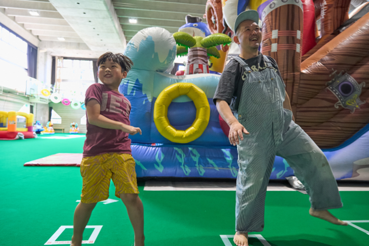 巨大な海賊船やカニのふわふわ遊具に、さっくんも大興奮!サメやカメ、宝箱などが潜む、ふわふわ冒険ゾーンで、お父さんと一緒に滑って登ってまた滑って……「もっともっと遊びたい!」