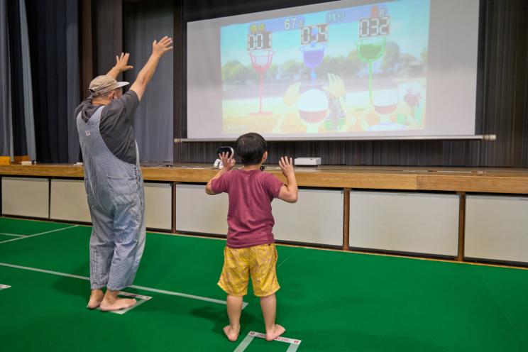 続いては、新感覚の体感ゲーム「TANO」に挑戦。手や体を使ったゲームにお父さんも夢中で、体育館中に笑い声が響きます。
