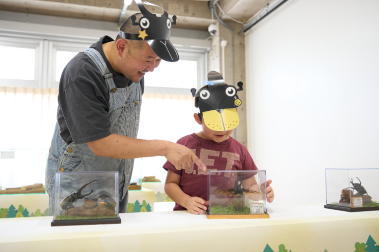 続いては3階の企画展示室へ。世界各地のカブトムシ&クワガタムシがずらりと並び、さっくんは「こんな大きいの見たことない!」とテンションMAX! 今にも動き出しそうな標本たちをじっくりと眺めていました。お父さんも思わず「これは自分が小学生のときに欲しかったやつだ…」と感慨深げ。