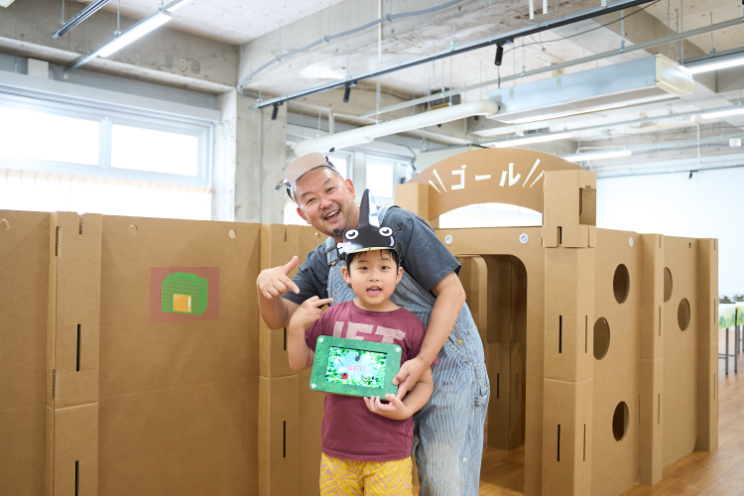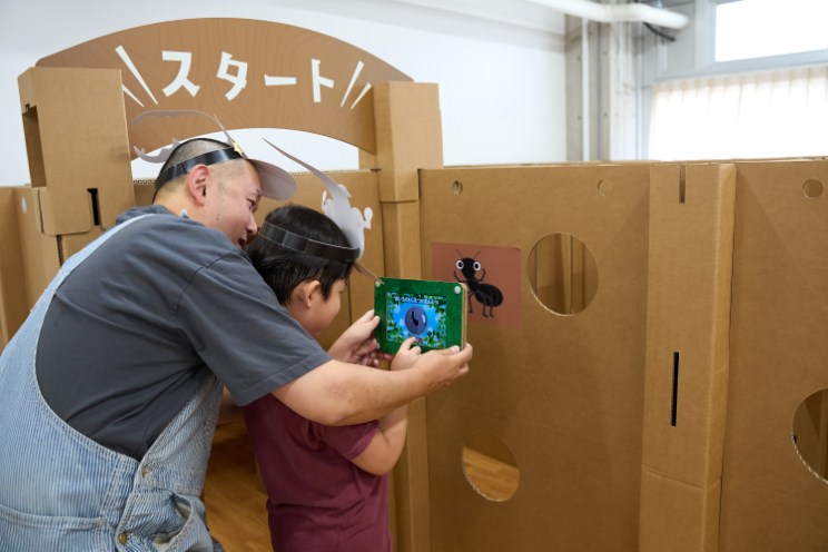 段ボールでできた大型迷路では、タブレットを使って昆虫を探す「採取ミッション」に挑戦。迷路の中を行ったり来たり、まさにリアルな昆虫ハンター気分!