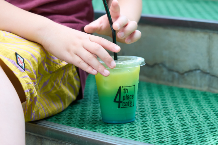 お父さんはアイスコーヒー(380円)を、さっくんはイベント限定ドリンク「まぜまぜ色変わりドリンク~2025夏~」(500円)をオーダー。オレンジジュースとブルーキュラソー、カルピスが層になった不思議なドリンクで、まぜると色が変化!まるで実験みたいなワクワク感と、色と味のギャップがとってもサイエンス!?